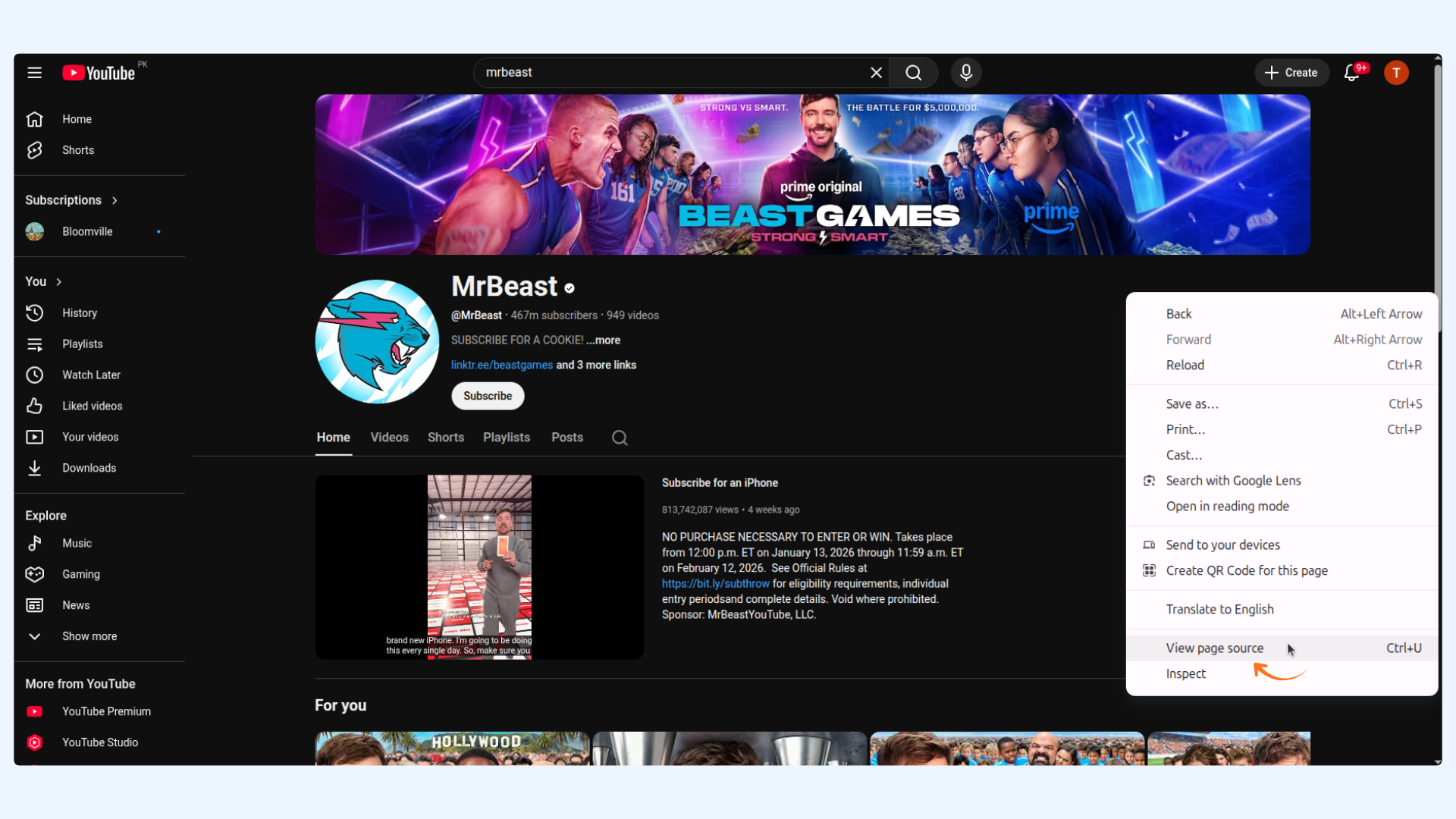 Right-click on an empty area of the page (as shown in the image), then select View Page Source.