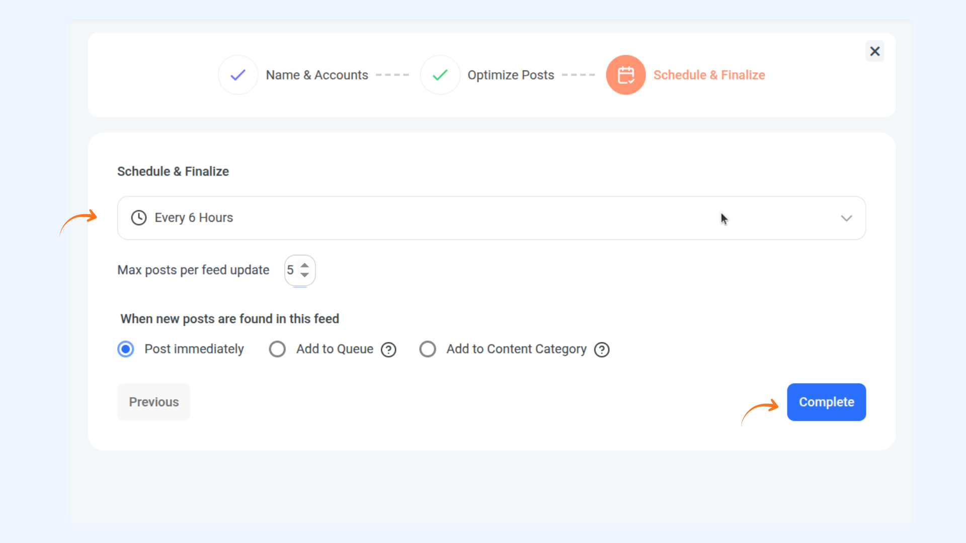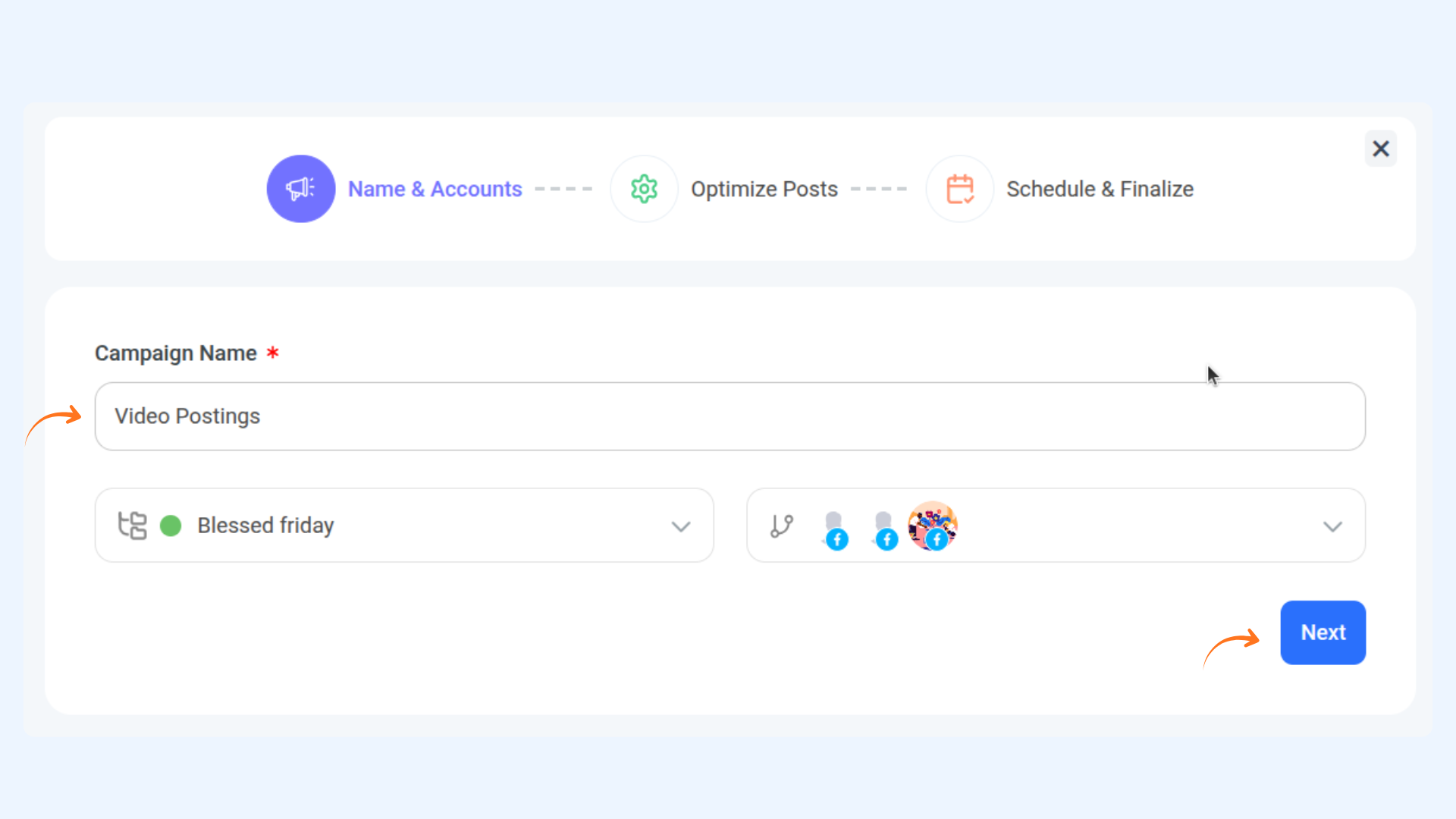 Choose the social account(s) where you want the automated posts to publish, then click Next.