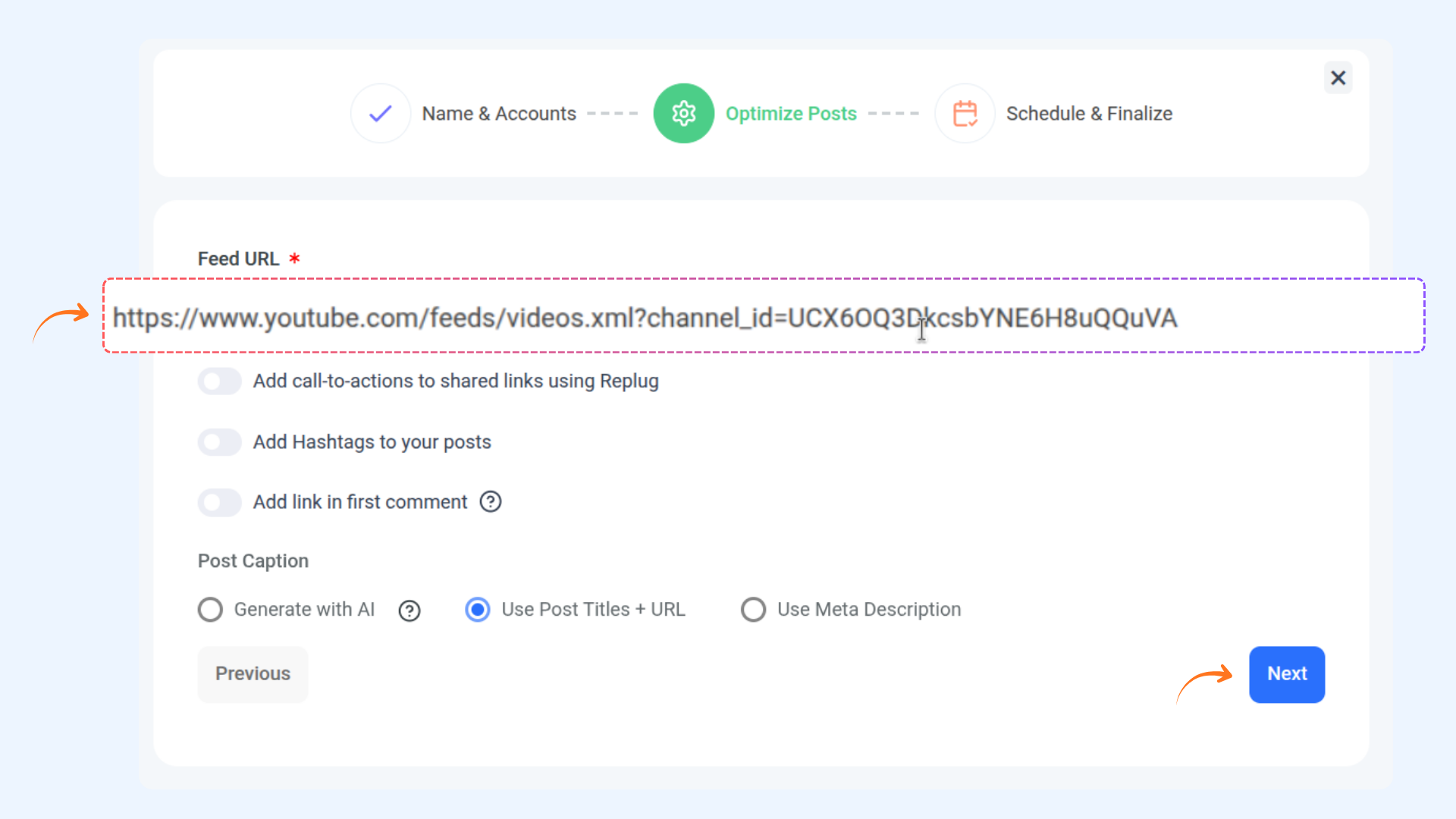Yes. You can add CTAs, hashtags, or choose different post variation formats such as title + URL, AI-generated variations, or meta descriptions.