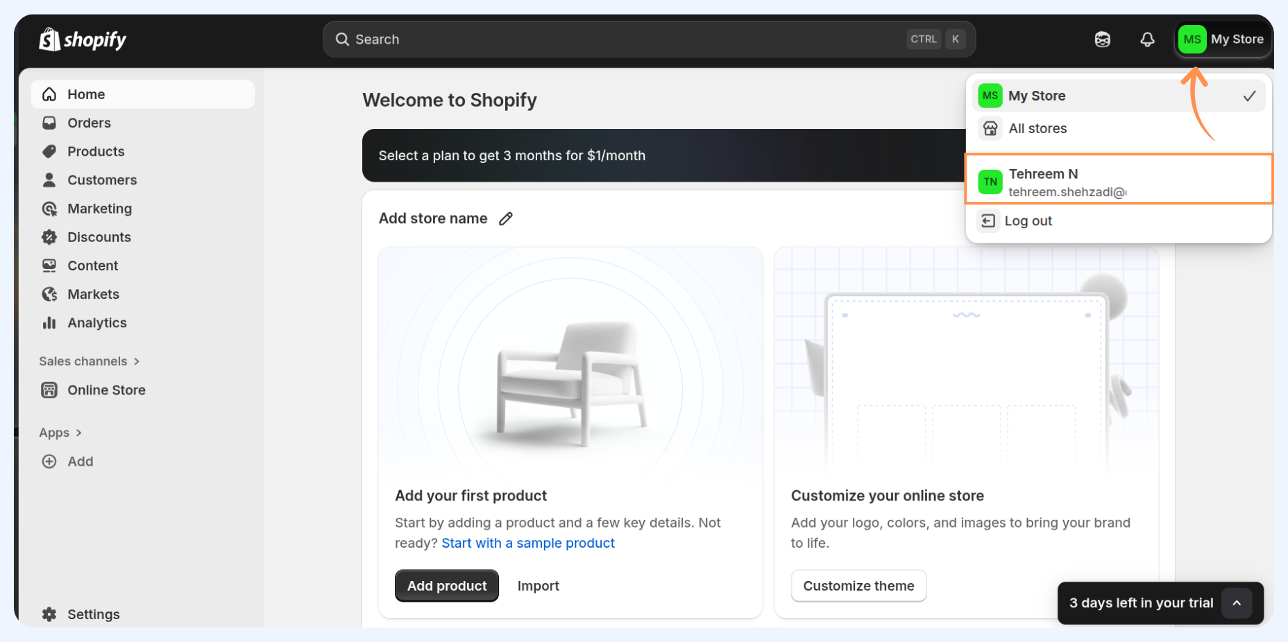 Once logged in, you’ll be directed to your Shopify account. From there, click on your profile icon in the top-right corner and select your profile .