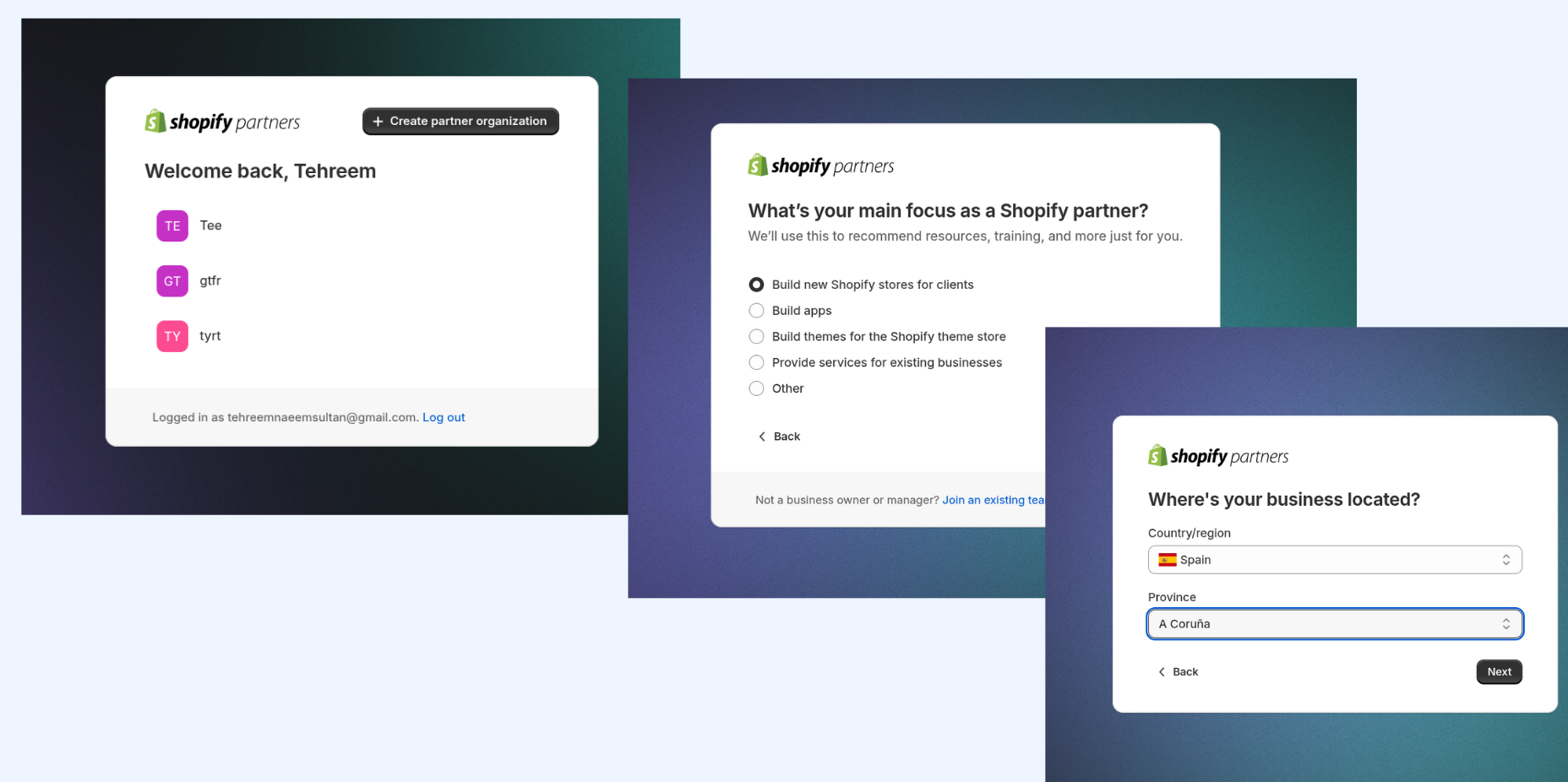 A: Visit the Shopify Partners link, complete the required details, and click Create Account.