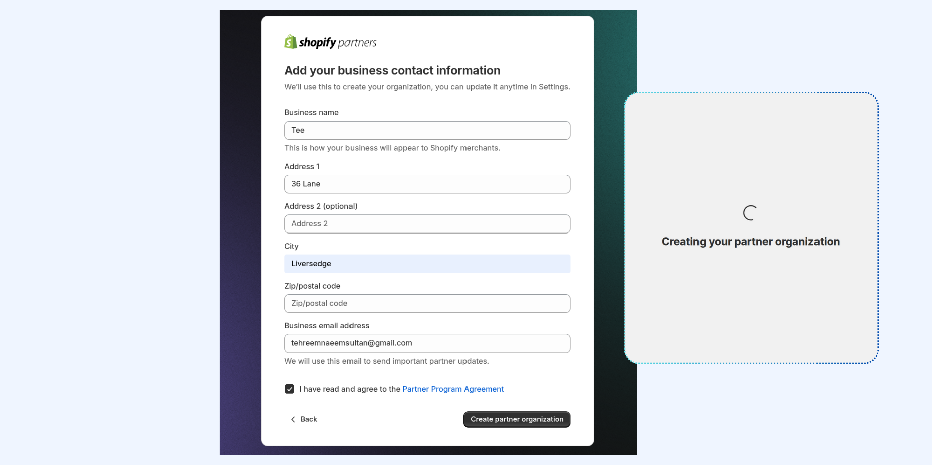 Add your business contact information, including your company name, email address, and website URL. This information helps identify your business within the Shopify Partner setup.