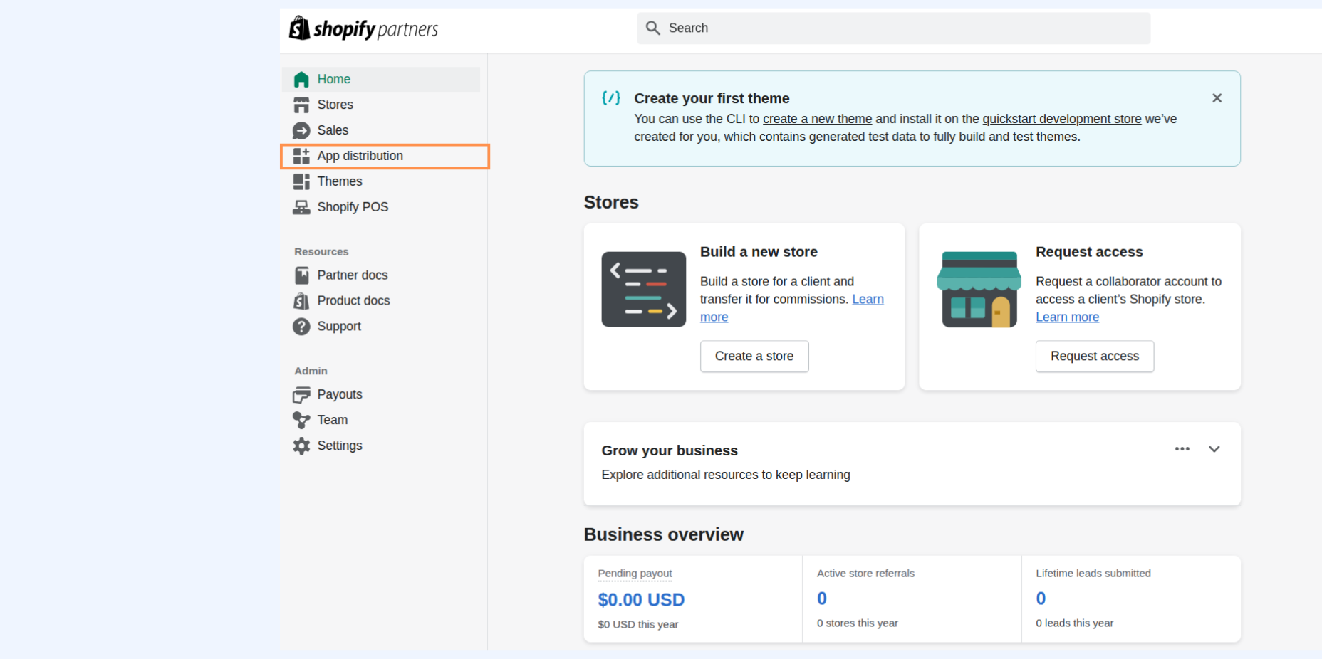 In the General section of your account, click on the blue icon link in the Shopify Partners section (as shown in the image below) to go to the Shopify Partners page.