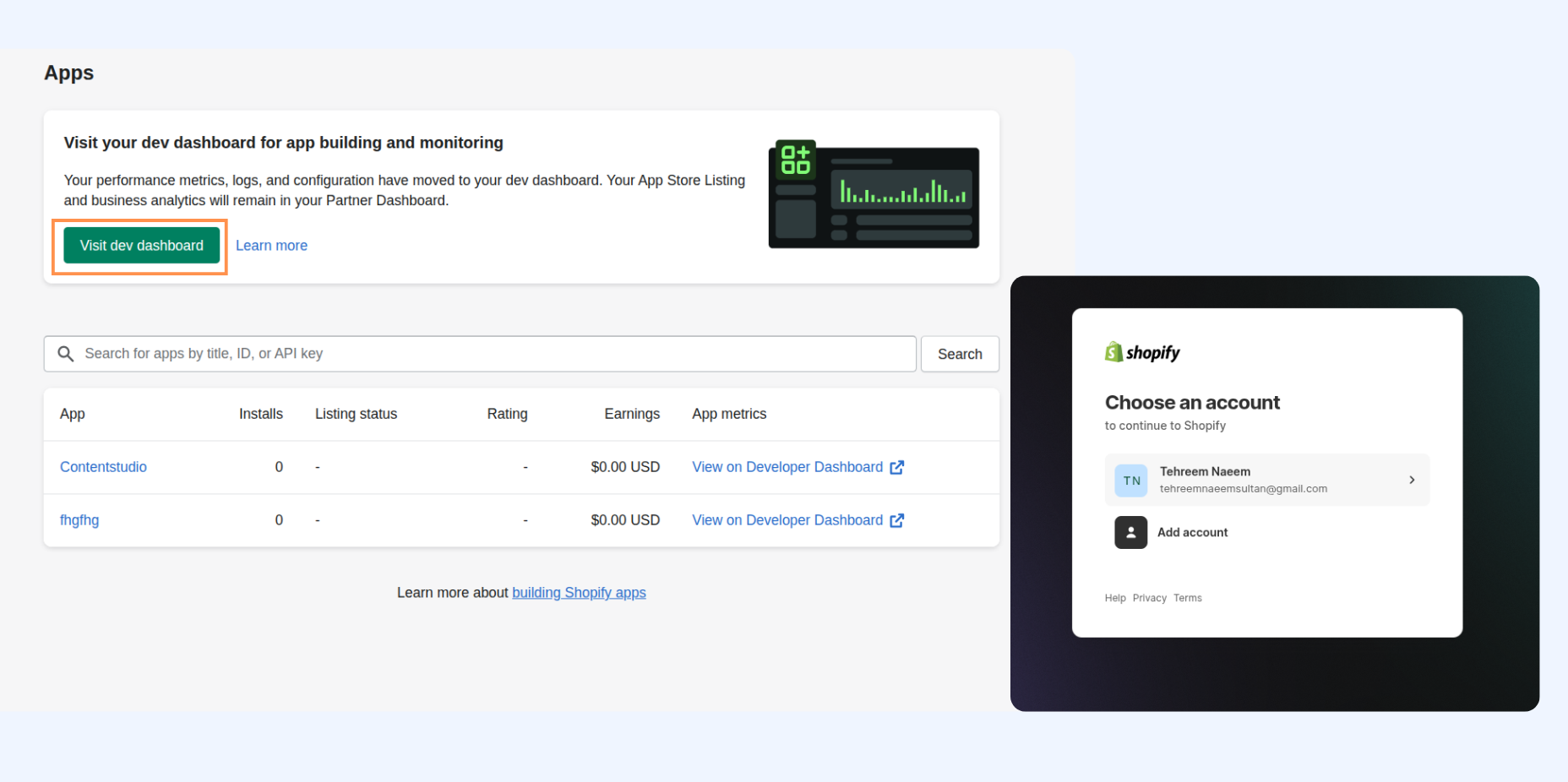Click on the Visit Dev Dashboard button and choose your Shopify Partner account from the list. If prompted, log in with your partner credentials to continue.