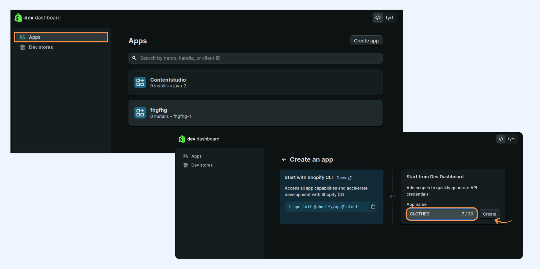 From your dev dashboard, click on Create App, then enter your App name and and click Create to proceed.