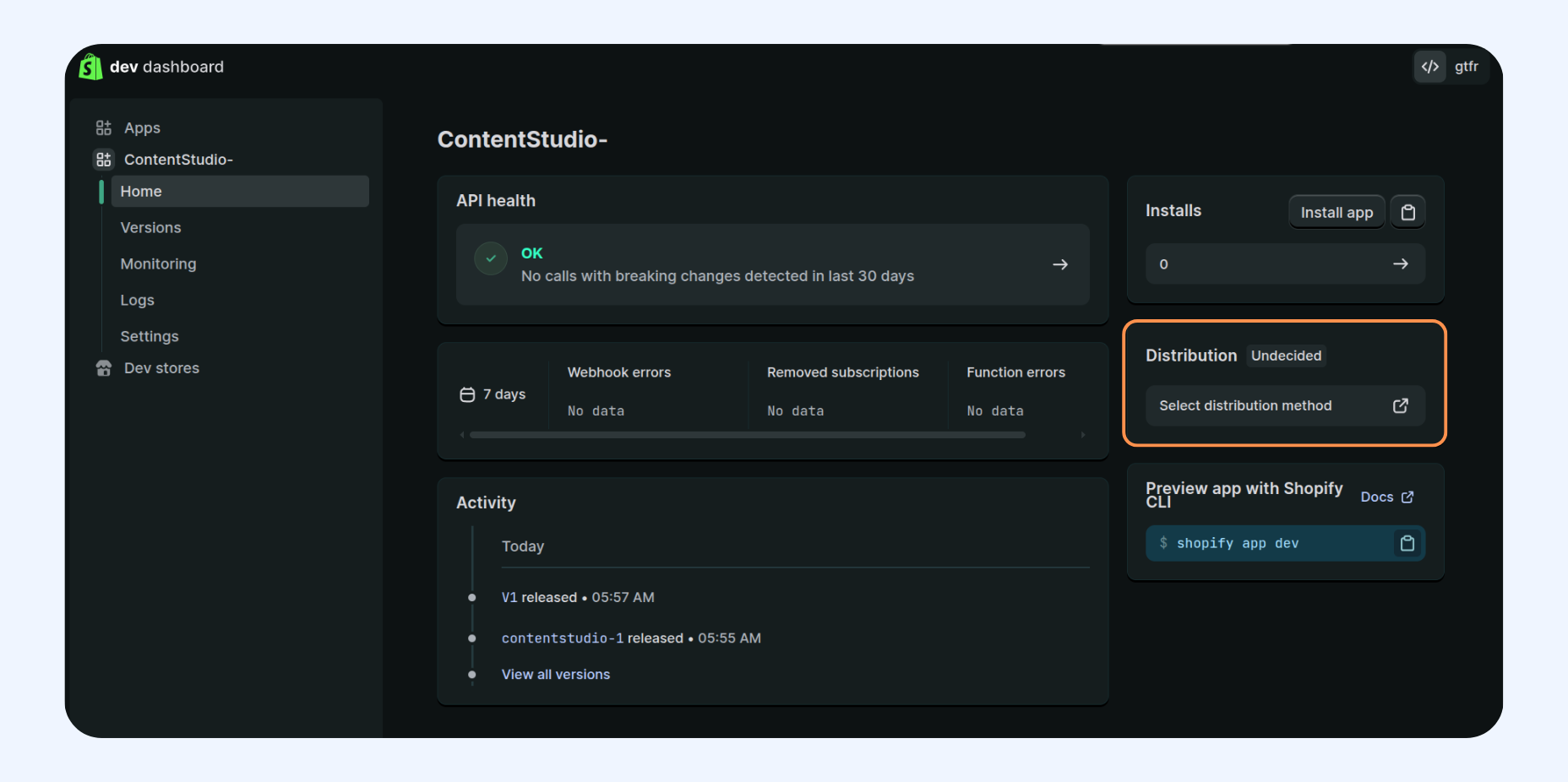 On the Dev Dashboard, go to the Home page of your app. Go to the Distribution section and click on Select Distribution Method.