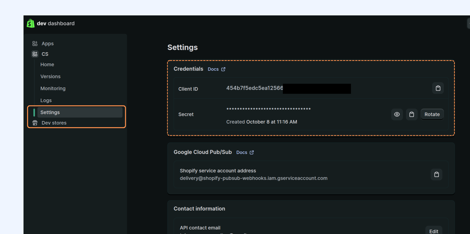 Copy the Client ID and Client Secret Key from the Settings section inside your app in the Dev Dashboard.