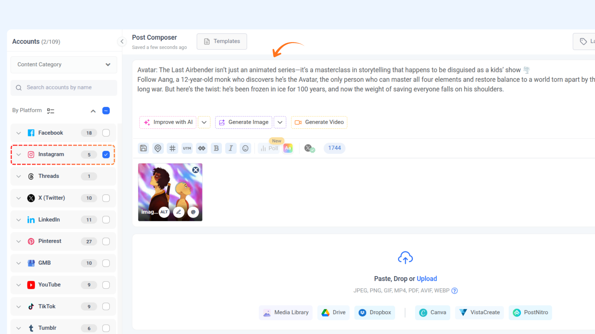 The First Comment feature allows you to schedule a comment to accompany your social media posts on Instagram, Facebook, YouTube, and LinkedIn. This is a great way to extend the reach of your posts while keeping the main caption concise and focused.