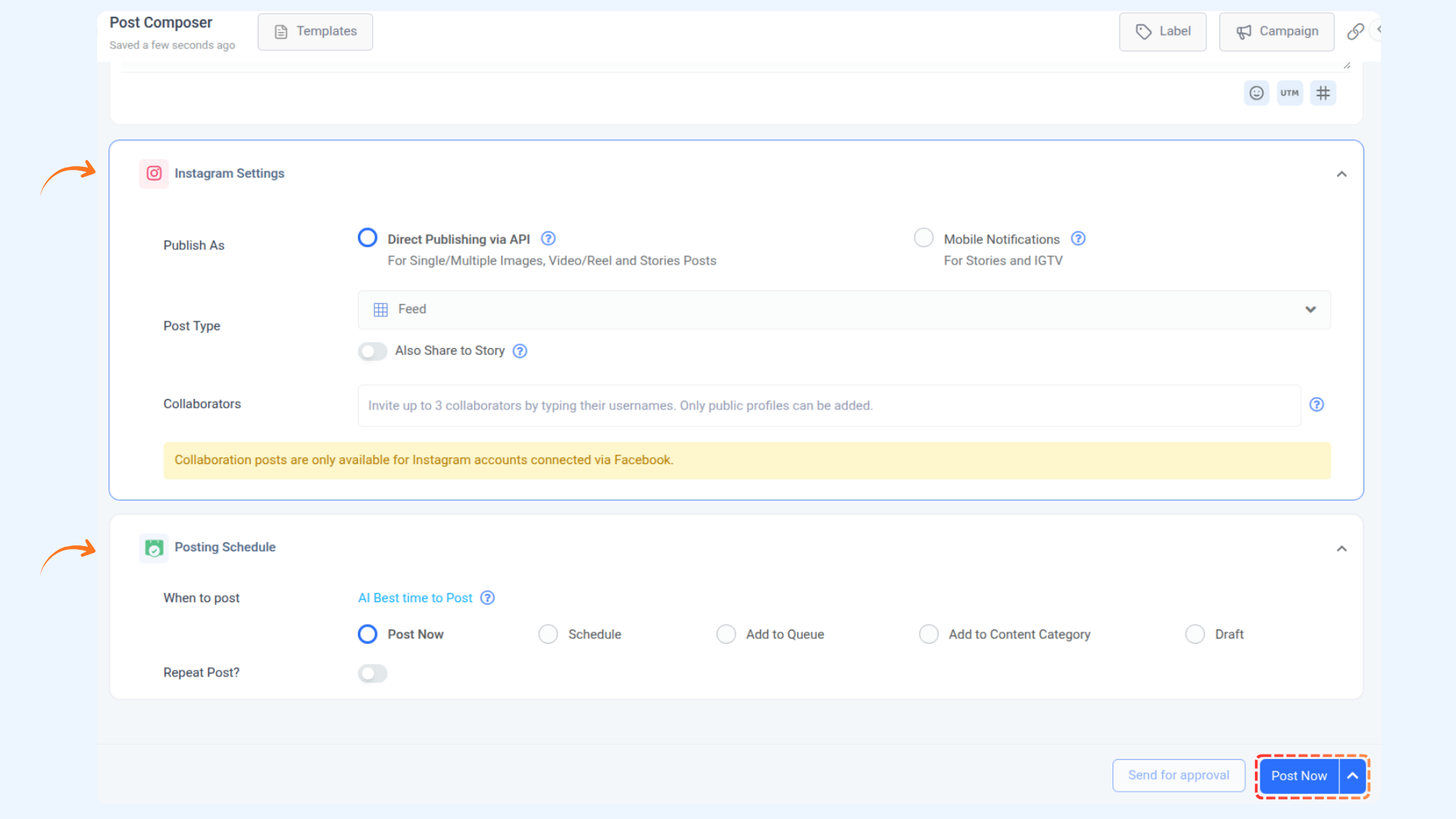 - Only for Auto Publish posts β select "Instagram API" while composing.