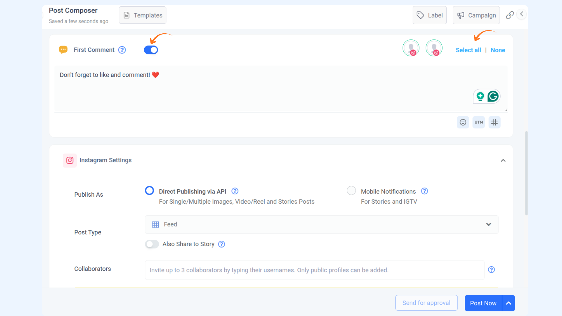 Important: To post the first comment on Instagram, set the publishing method to API. The First Comment feature for Instagram is supported with API integrations.