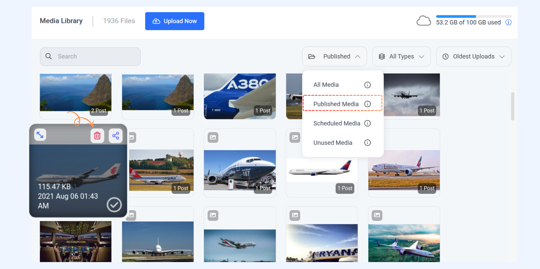 - Published Media: Shows media files that are used in posts already published. Files linked to scheduled or draft posts won’t appear here.