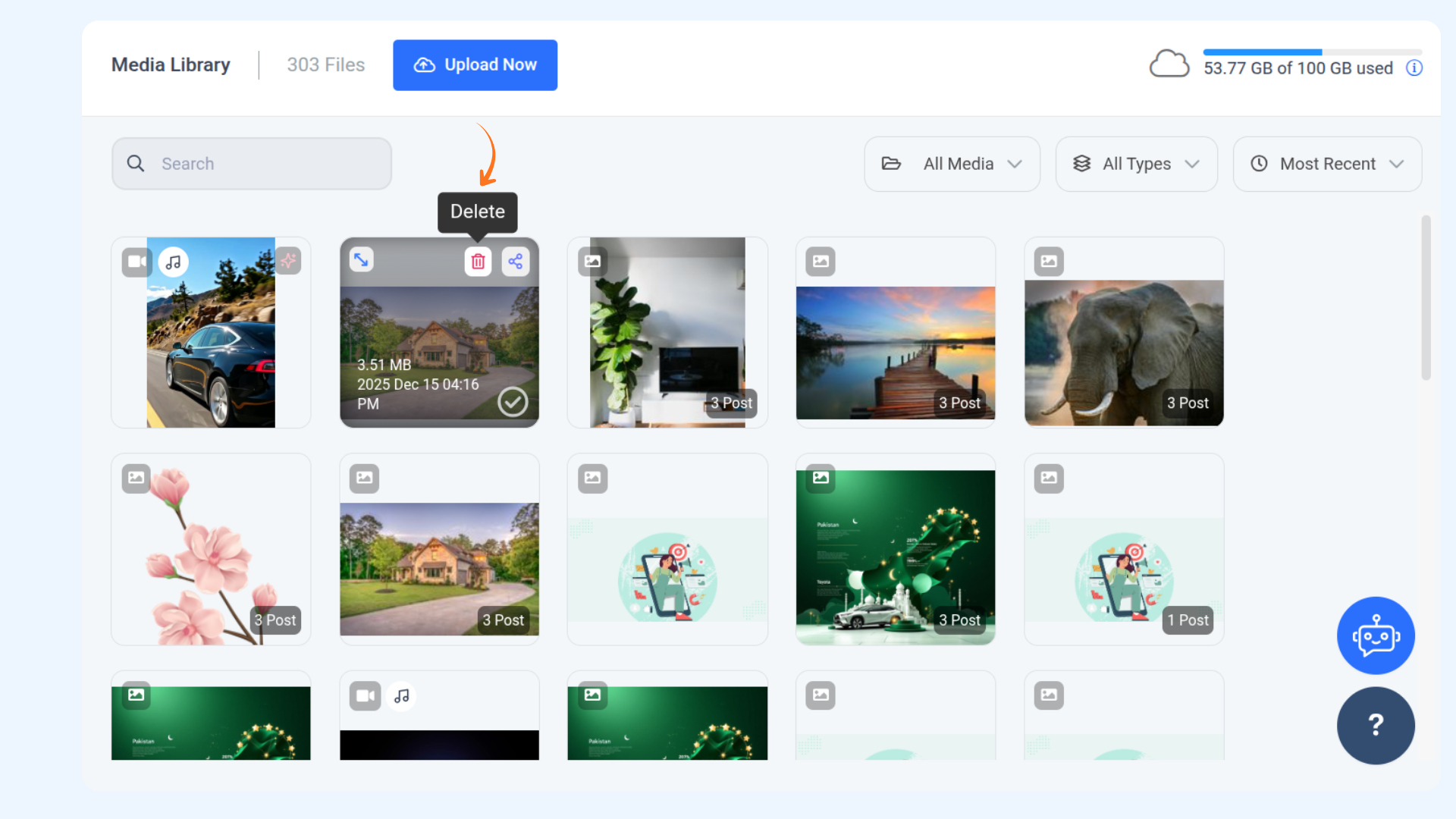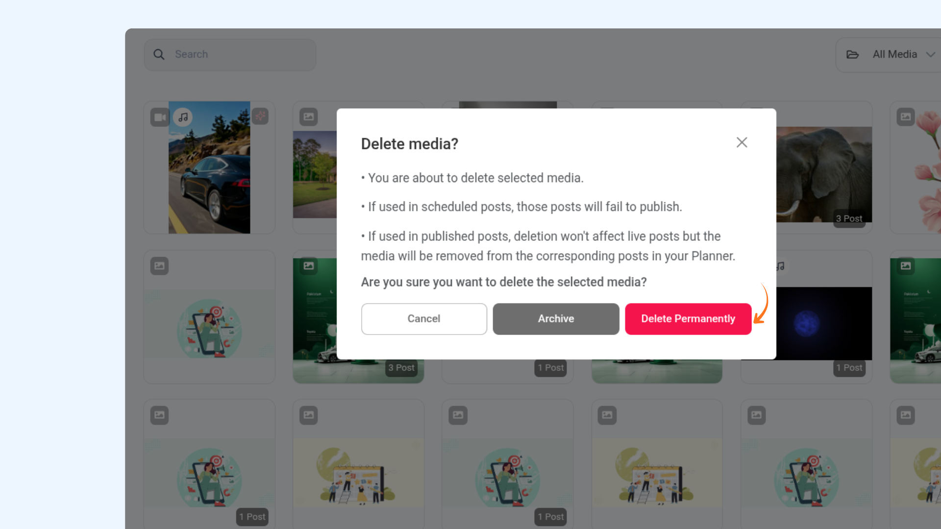- Delete only the published media — since these files are already live on platforms, removing them won’t affect upcoming posts.
