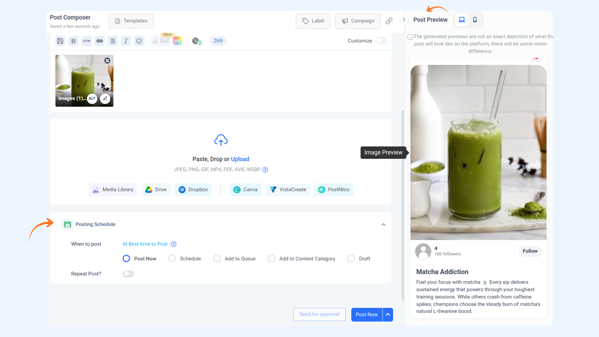 A: Yes, ContentStudio provides a preview on the right side of the screen in the composer, allowing you to see how your post will look before posting.