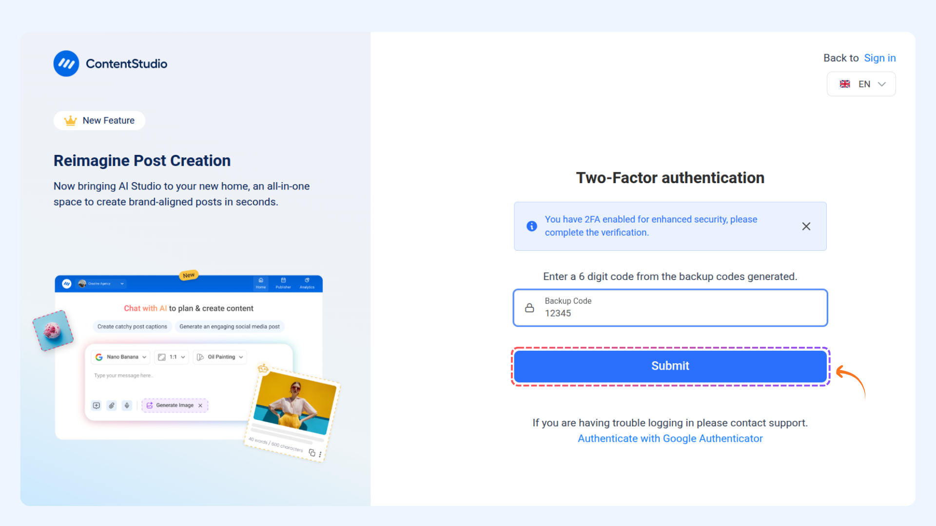 If you’re unable to access your authentication app, you can use one of your recovery/backup codes to log in to your account.