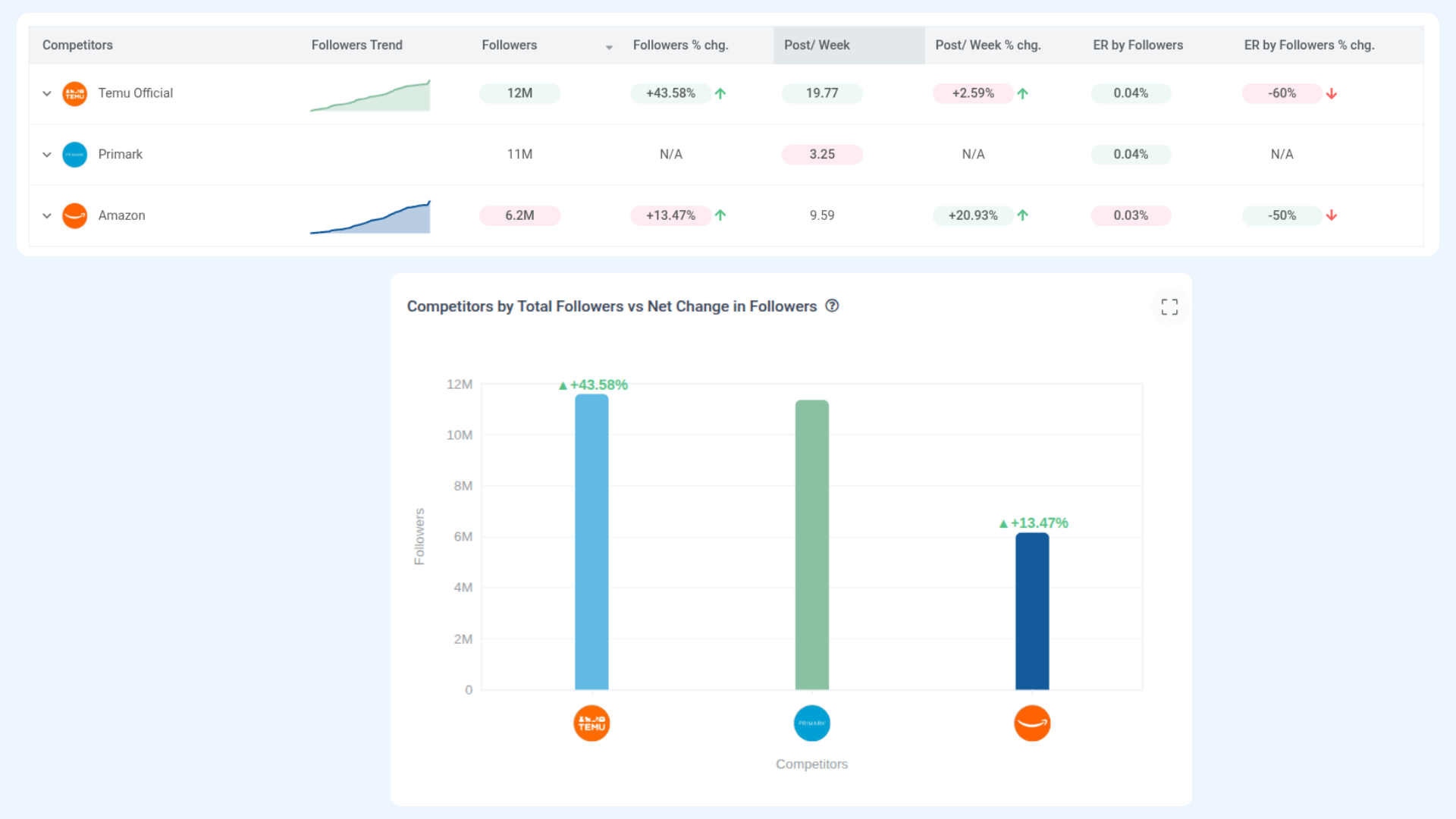 At the top, you’ll see all competitors in the list along with their followers and engagement rates.