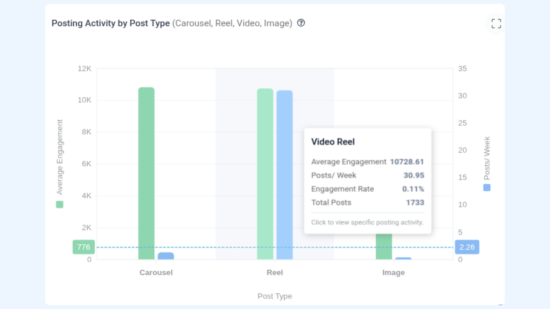 Review posting activity by post type (Reels, Carousels, Images) to see which format performs best.