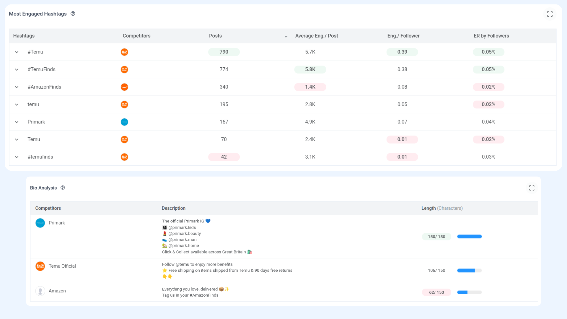 Under Bio Analysis, compare competitor bios and character length usage to refine your own profile description strategy.