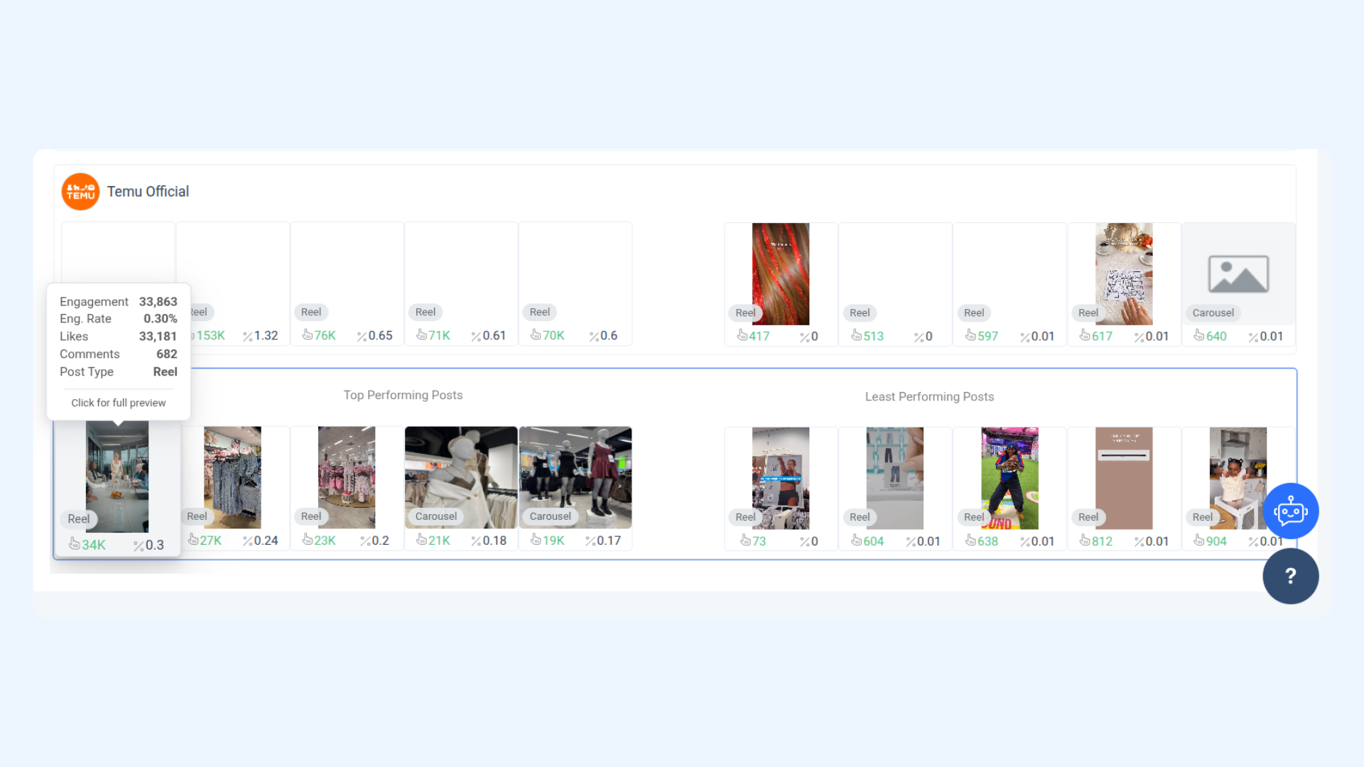 Scroll to view top-performing and least-performing posts. Hover over a post to see engagement breakdown including likes, comments, and post type.