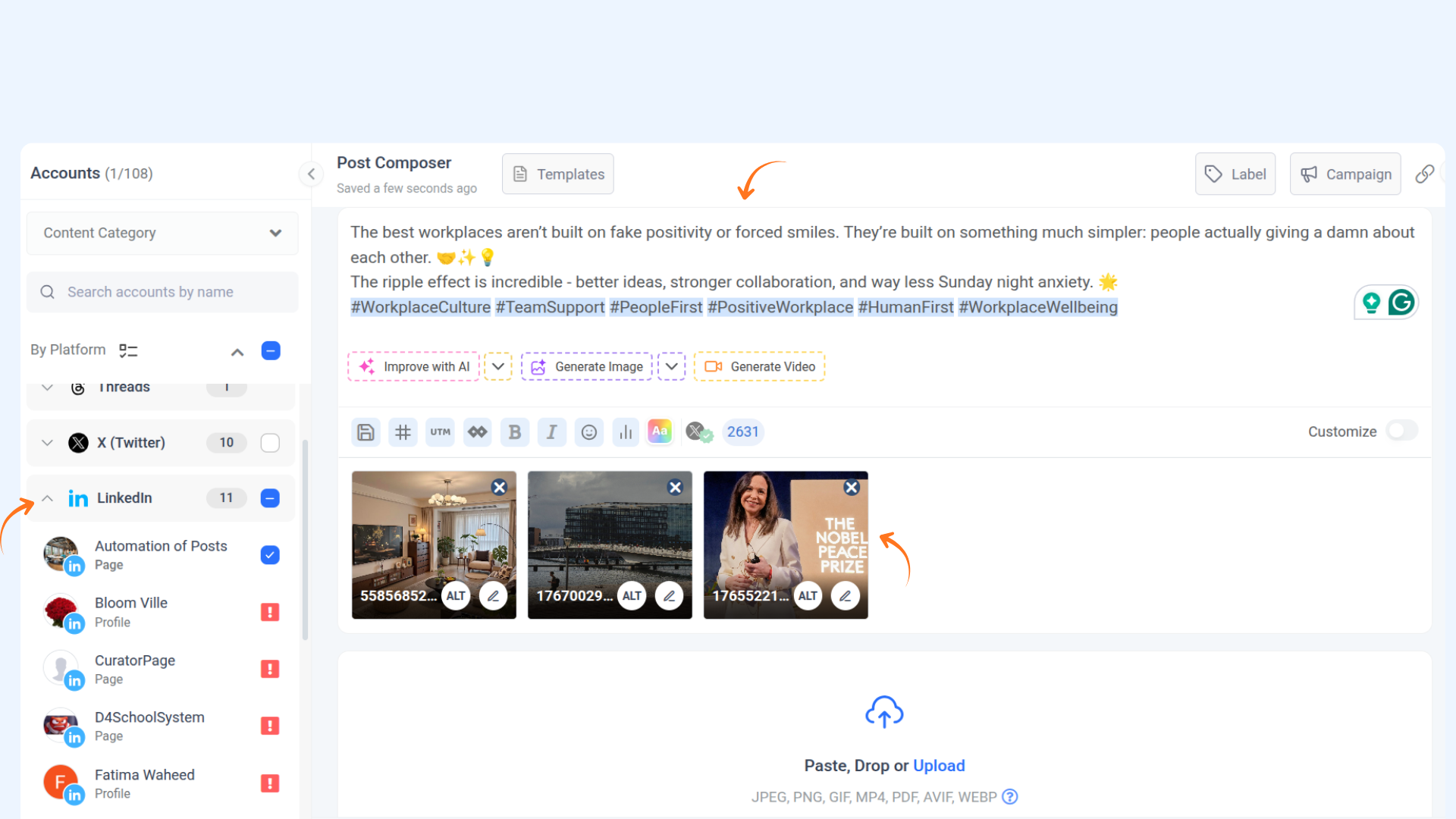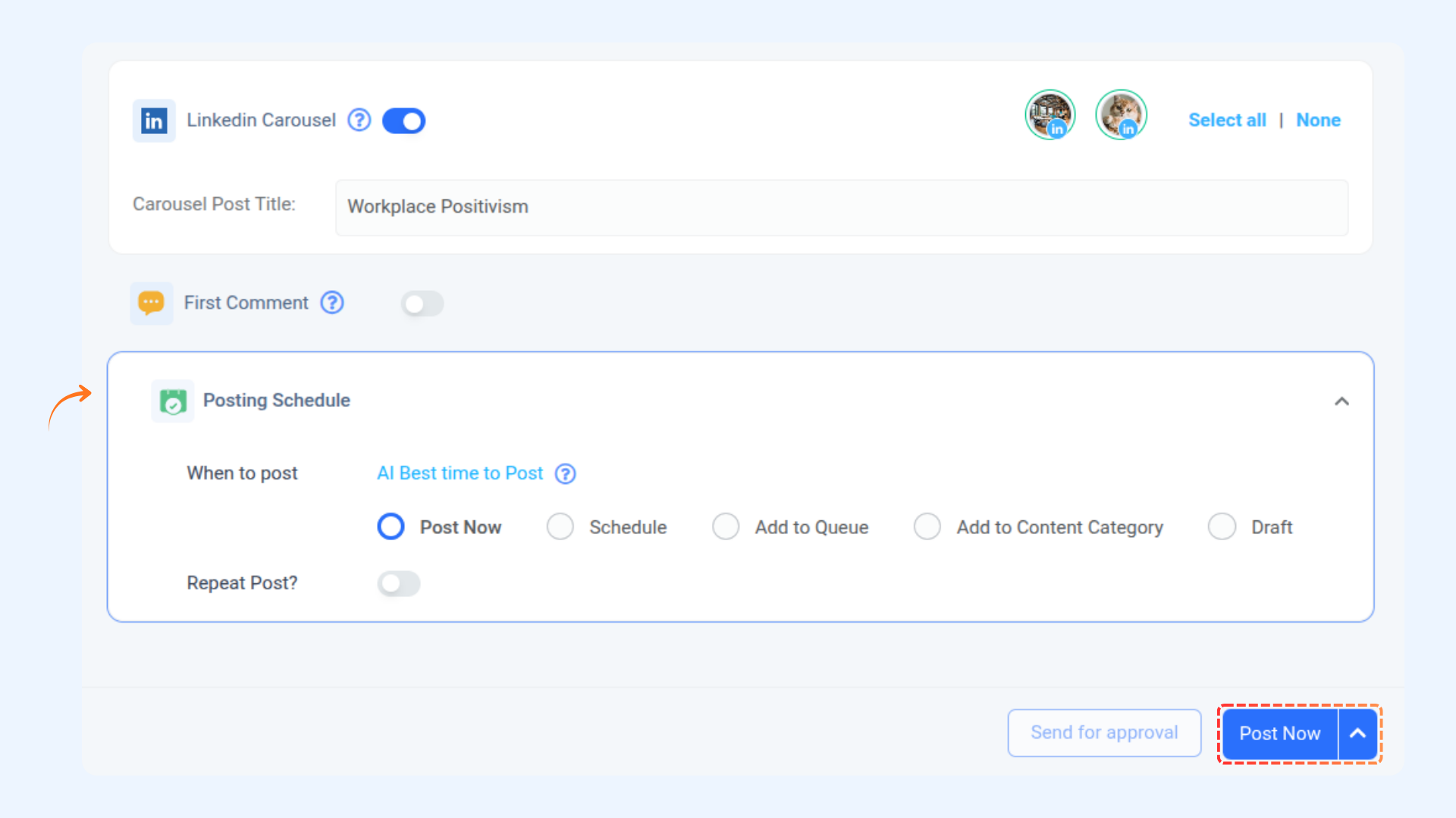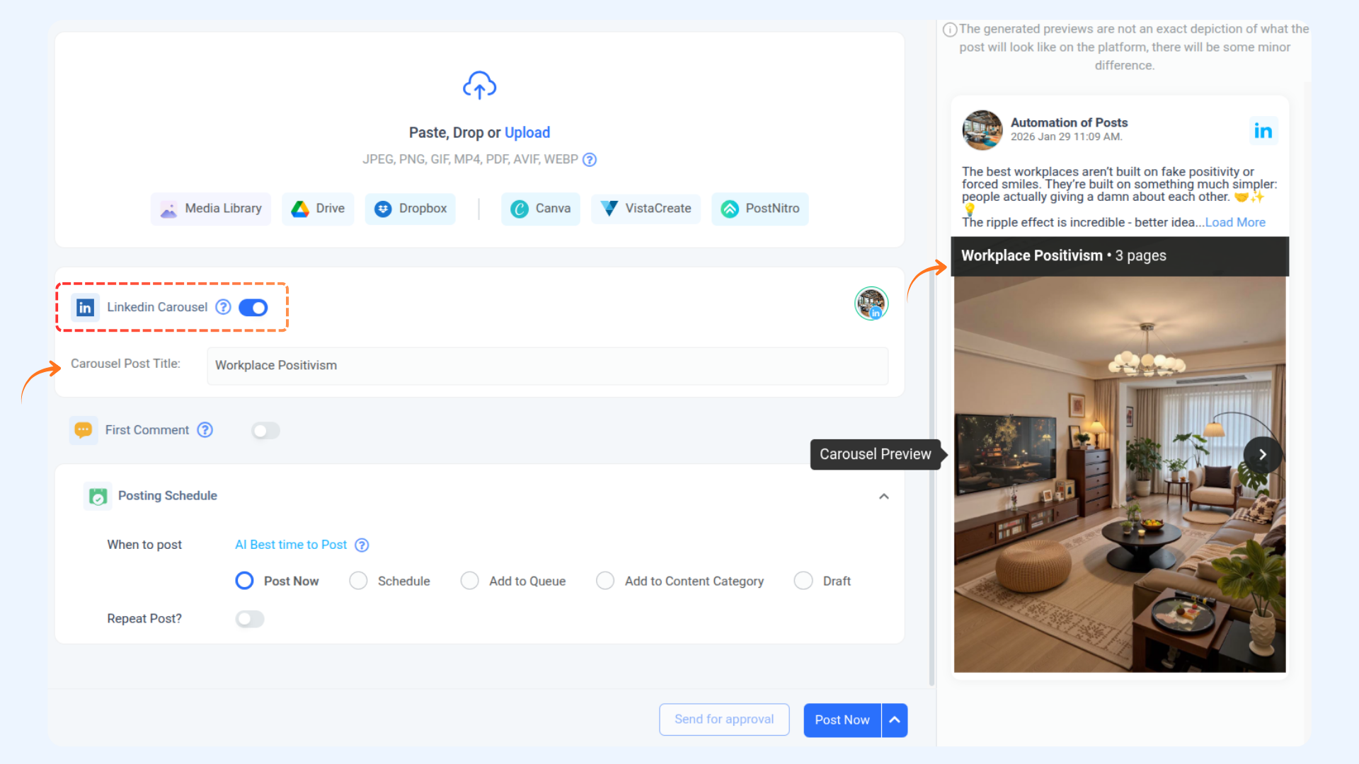 - LinkedIn carousel posts can be published to both Profiles and Pages.