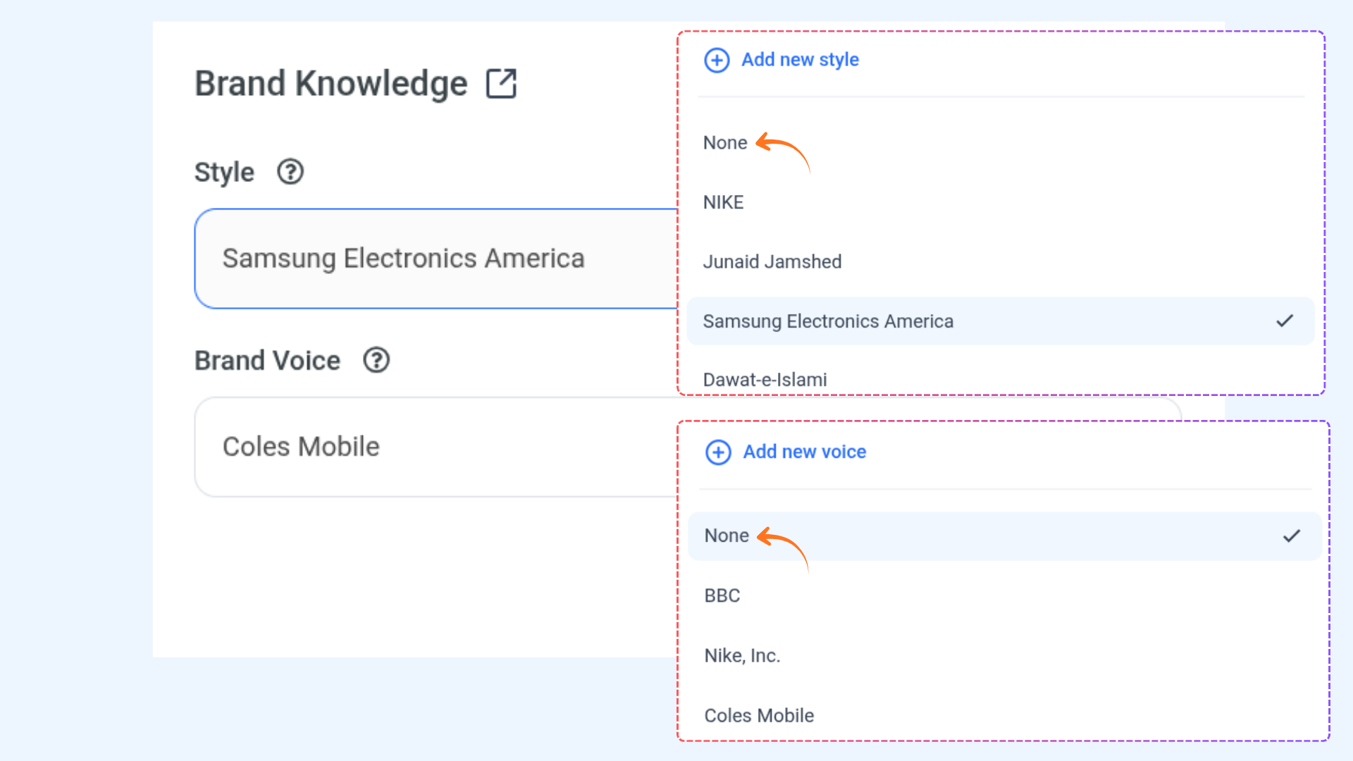 You can also choose None for both Brand Voice and Brand Style if you prefer not to apply any predefined tone or formatting. Selecting this option allows the AI to generate content using its default behavior, giving you full flexibility for one-off content or experimentation without brand constraints.