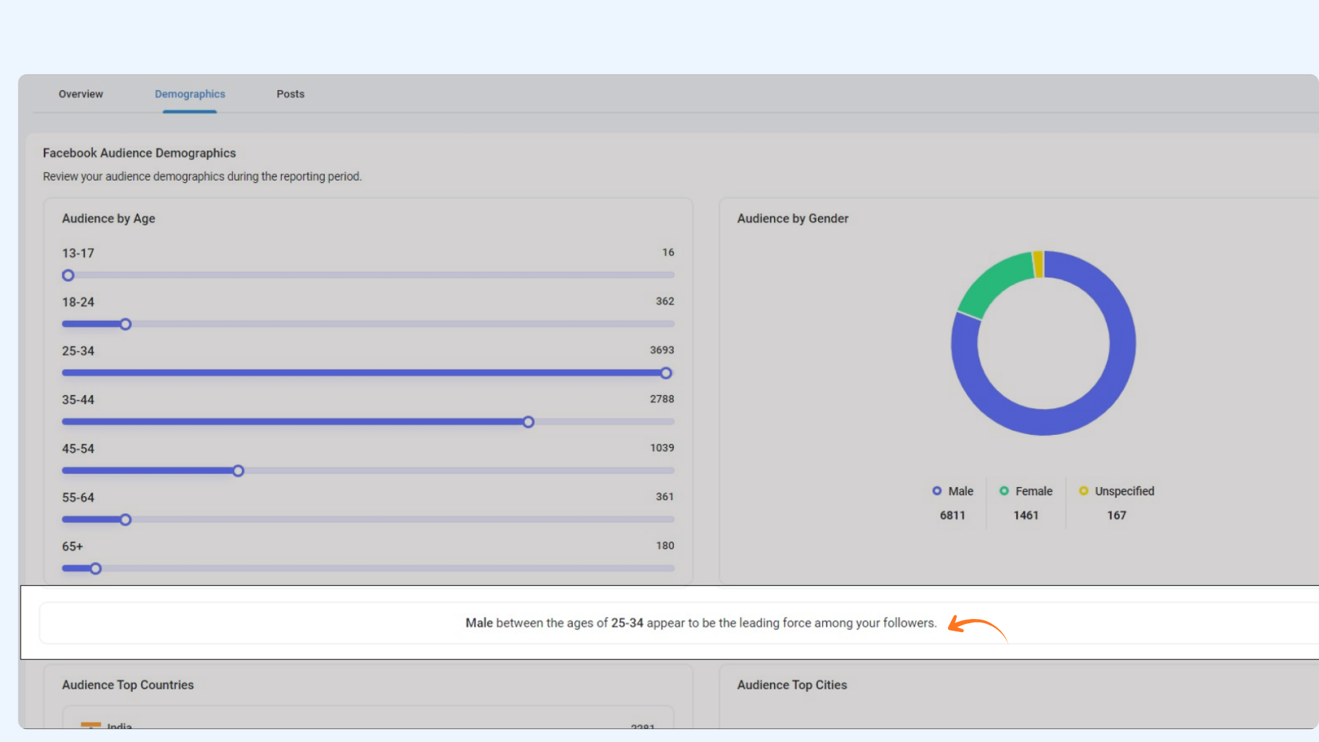 The demographics tab shows your top audience by gender and age, as well as your top location.